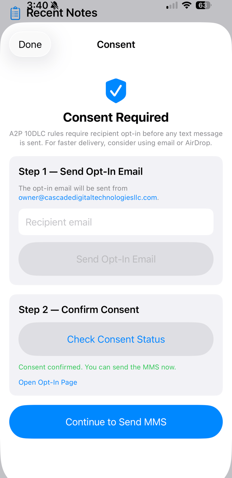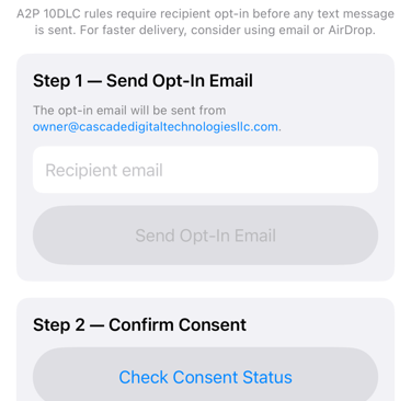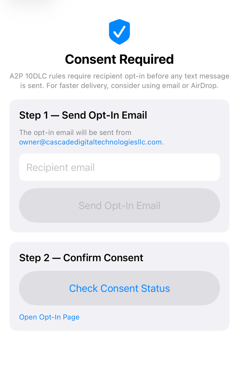 Consent Verified — After the recipient opts in, the app confirms their consent status and enables the send button.