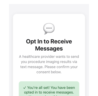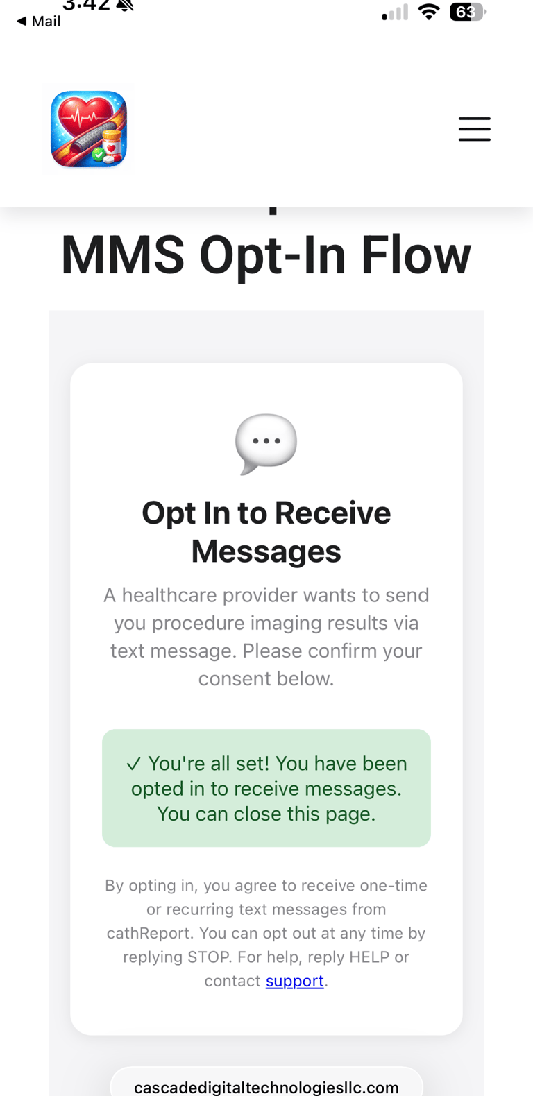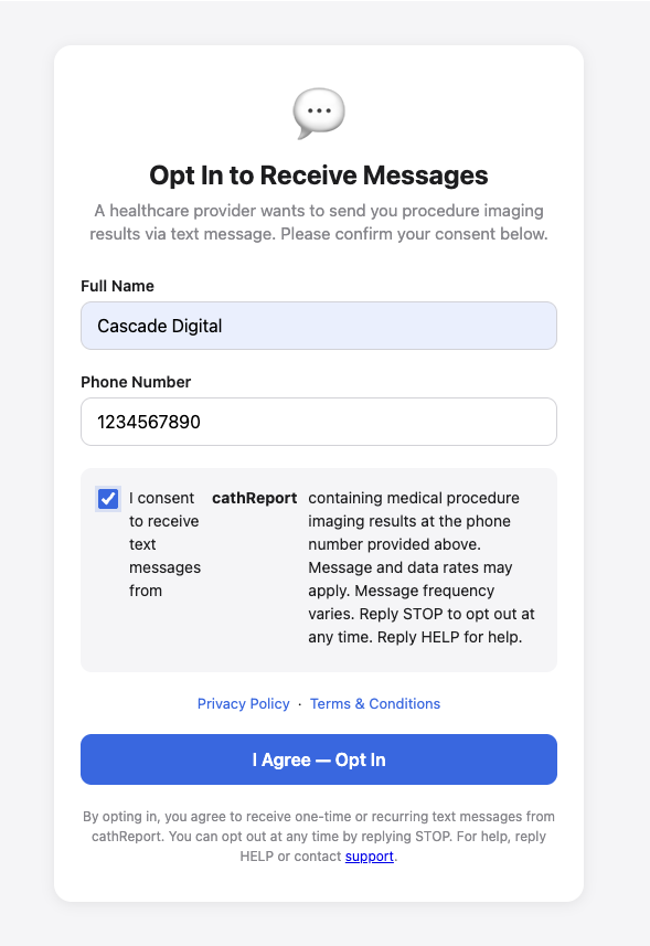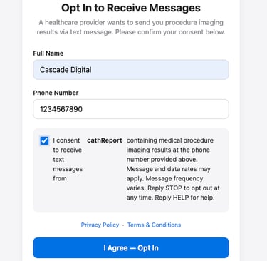 Recipients opt in by visiting https://cascadedigitaltechnologiesllc.com/cathreportopt-in where they enter their full name and phone number, check a TCPA consent box that reads "I consent to receive text messages from cathReport containing medical procedure imaging results. Message and data rates may apply. Message frequency varies. Reply STOP to opt out at any time. Reply HELP for help," and tap "I Agree — Opt In." Consent is logged with name, phone, IP address, and timestamp. The iOS app verifies consent via API before each send. If no consent exists, the send is blocked. Screenshots of the full workflow are at https://cascadedigitaltechnologiesllc.com/a2p-compliance